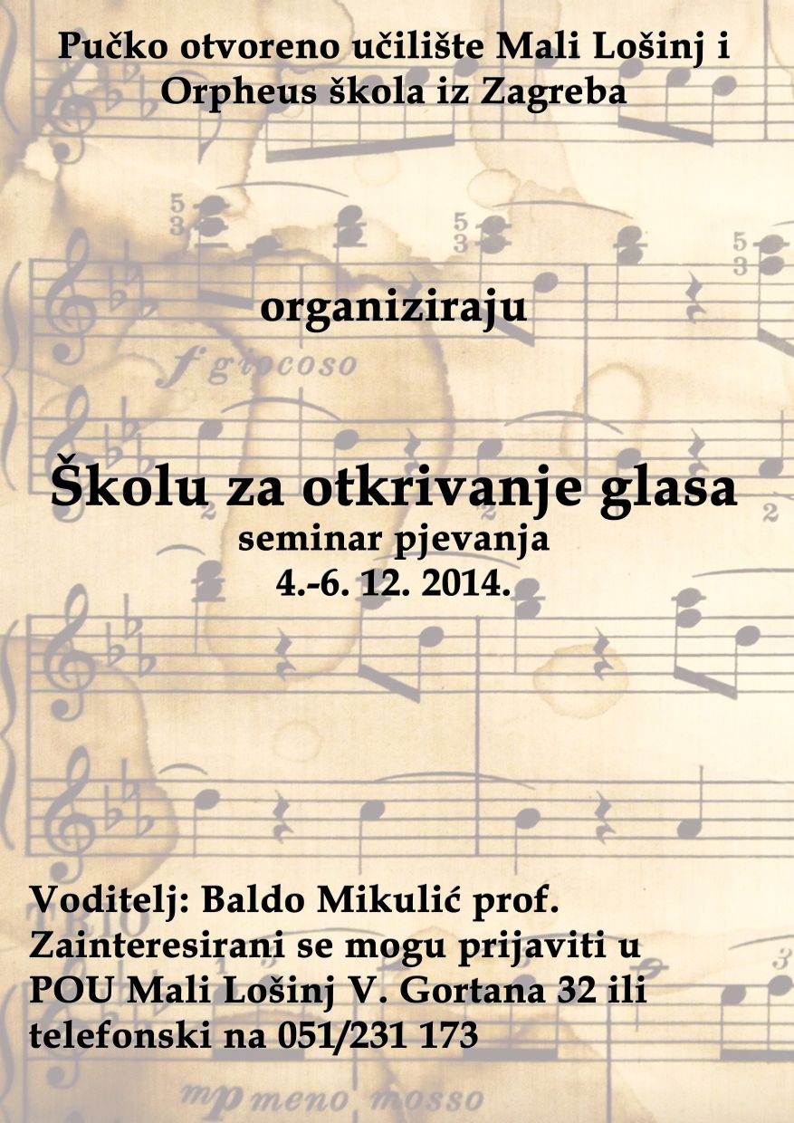 Od 4.-6. 12.2014., održat će se seminar pjevanja, pod vodstvom prof. Balda Mikulića. Tečaj pjevanja obuhvatit će vježbe pjevanja koje se temelje na metodi pjevanja ²Škola za otkrivanje glasa² te jednoglasno i višeglasno pjevanje.