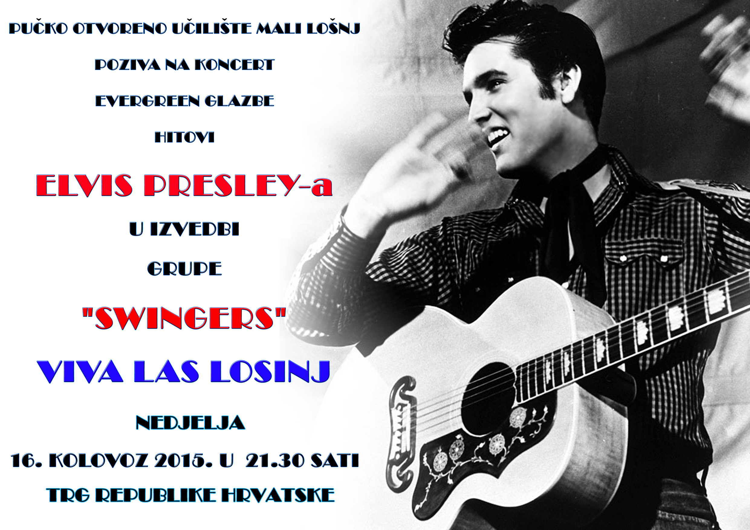 PUČKO OTVORENO UČILIŠTE MALI LOŠINJpoziva na koncertEVERGREEN GLAZBEHITOVIELVIS PRESLEY-au izvedbigrupe