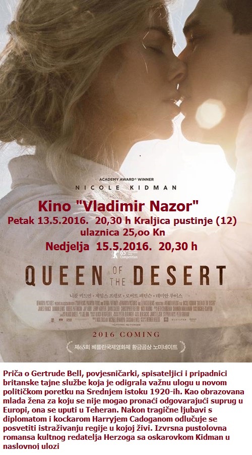 Priča o Gertrude Bell, povjesničarki, spisateljici i pripadnici britanske tajne službe koja je odigrala važnu ulogu u novom političkom poretku na Srednjem istoku 1920-ih. Kao obrazovana mlada žena za koju se nije mogao pronaći odgovarajući suprug u Europi, ona se uputi u Teheran. Nakon tragične ljubavi s diplomatom i kockarom Harryjem Cadoganom odlučuje se posvetiti istraživanju regije u kojoj živi. Izvrsna pustolovna romansa kultnog redatelja Herzoga sa oskarovkom Kidman u naslovnoj ulozi |