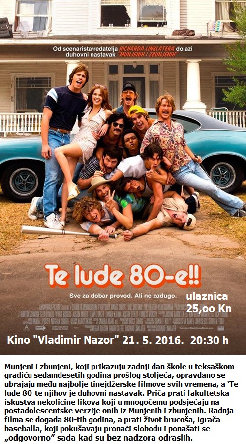 Munjeni i zbunjeni, koji prikazuju zadnji dan škole u teksaškom gradiću sedamdesetih godina prošlog stoljeća, opravdano se ubrajaju među najbolje tinejdžerske filmove svih vremena, a ‘Te lude 80-te njihov je duhovni nastavak. Priča prati fakultetska iskustva nekolicine likova koji u mnogočemu podsjećaju na postadolescentske verzije onih iz Munjenih i zbunjenih. Radnja filma se događa 80-tih godina, a prati život brucoša, igrača baseballa, koji pokušavaju pronaći slobodu i ponašati se „odgovorno” sada kad su bez nadzora odraslih. |