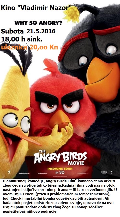 U animiranoj 3D komediji „Angry Birds Film“ konačno ćemo otkriti zbog čega su ptice toliko bijesne.Radnja filma vodi nas na otok nastanjen isključivo sretnim pticama – ili barem većinom njih. U ovom raju, Crveni (ptica s problematičnim temperamentom), ludi Chuck i nestabilni Bomba oduvijek su bili autsajderi. Ali kada otok posjete misteriozne zelene svinje, upravo će na ovu trojicu pasti zadatak otkriti zbog čega su novopridošlice posjetile baš njihovo područje. |