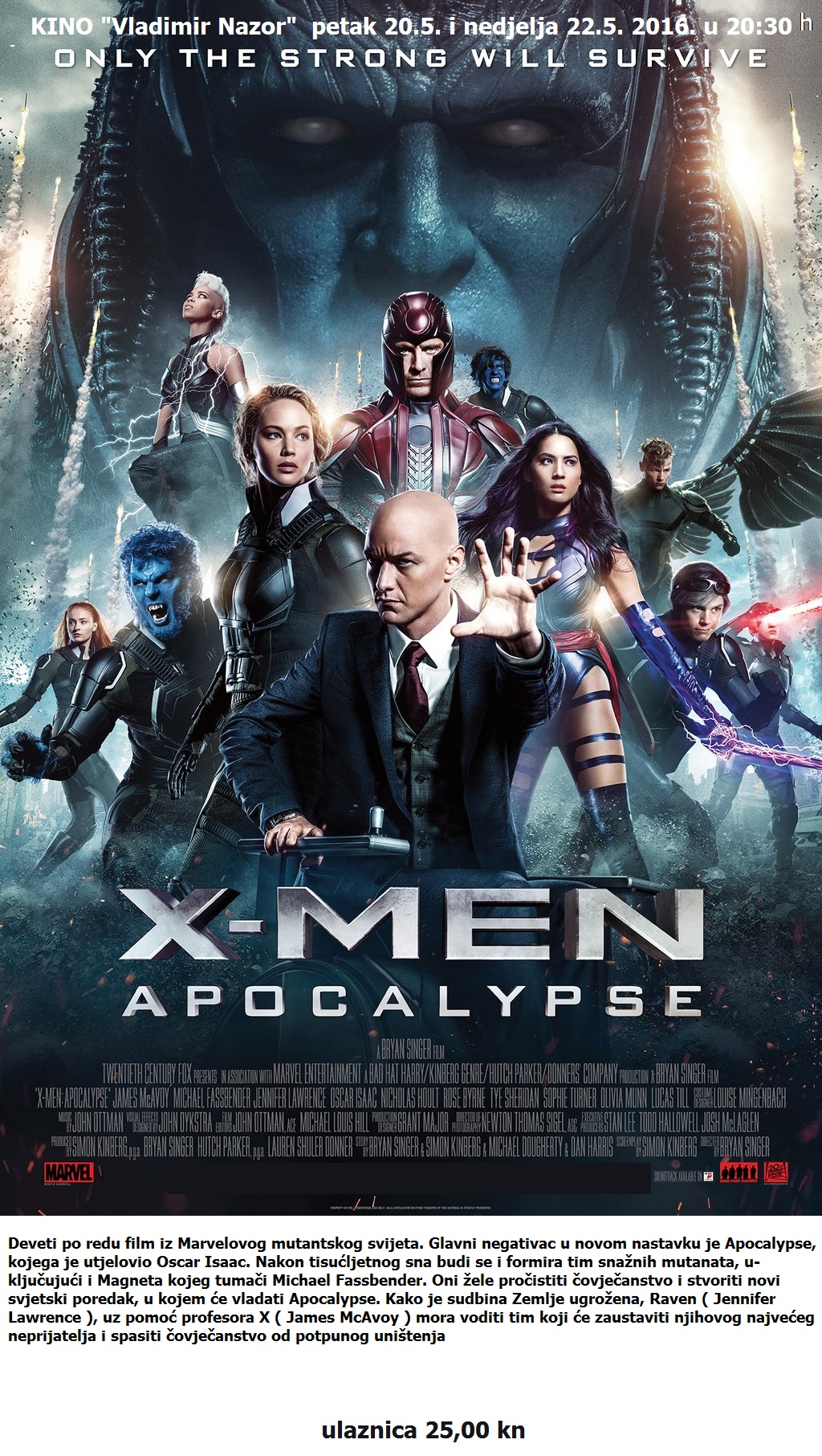 Deveti po redu film iz Marvelovog mutantskog svijeta. Glavni negativac u novom nastavku je Apocalypse, kojega je utjelovio Oscar Isaac. Nakon tisućljetnog sna budi se i formira tim snažnih mutanata, uključujući i Magneta kojeg tumači Michael Fassbender. Oni žele pročistiti čovječanstvo i stvoriti novi svjetski poredak, u kojem će vladati Apocalypse. Kako je sudbina Zemlje ugrožena, Raven ( Jennifer Lawrence ), uz pomoć profesora X ( James McAvoy ) mora voditi tim koji će zaustaviti njihovog najvećeg neprijatelja i spasiti čovječanstvo od potpunog uništenja |