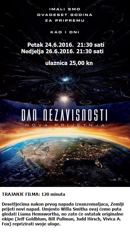 Desetljećima nakon prvog napada izvanzemaljaca, Zemlji prijeti novi napad. Umjesto Willa Smitha ovaj ćemo puta gledati Liama Hemswortha, no zato će ostatak originalne ekipe (Jeff Goldblum, Bill Pullman, Judd Hirsch, Vivica A. Fox) reprizirati svoje uloge. |