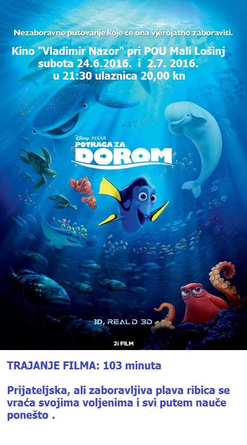 Disney i Pixar u animiranom filmu Potraga za Dorom vraćaju na velike ekrane obožavanu i zaboravljivu plavu tang ribicu Doru (glas Suzane Nikolić), koja sretno živi unutar podvodnog grebena s Nemom (glas Angela Anočić) i Merlinom (glas Saša Anočić). Kada se Dora odjednom sjeti da ju negdje traži njena obitelj, ovaj trio kreće u životnu avanturu preko oceana sve do prestižnog rehabilitacijskog centra i akvarija, kalifornijskog Insituta za svijet podmorja. Kako bi pronašla svoju mamu (glas Ksenija Pajić) i tatu (glas Draško Zidar), Dora zatraži pomoć od troje najintrigantnijih stanovnika Instituta za svijet podmorja: Boška (glas Filip Šovagović), svadljive hobotnice koja često bježi zaposlenicima Instituta, bijelog kita Ljudevita (glas Ranko Zidarić) koji je uvjeren da su njegove eholokacijske sposobnosti van funkcije i kratkovidnog bijelog kita Nade (glas Hana Hegedušić). Spretno navigirajući kompleksnim sustavom Instituta, Dora zajedno sa svojim prijateljima otkriva obiteljske i prijateljske čari.