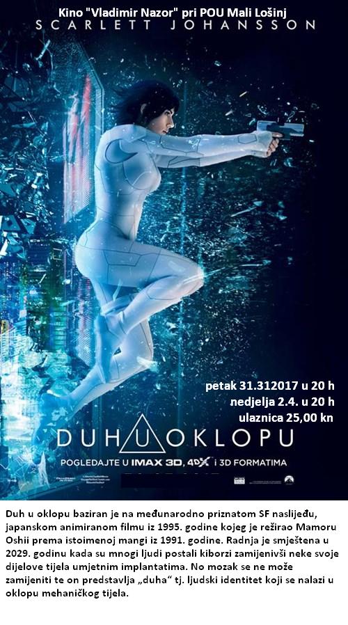 Duh u oklopu baziran je na međunarodno priznatom SF naslijeđu, japanskom animiranom filmu iz 1995. godine kojeg je režirao Mamoru Oshii prema istoimenoj mangi iz 1991. godine. Radnja je smještena u 2029. godinu kada su mnogi ljudi postali kiborzi zamijenivši neke svoje dijelove tijela umjetnim implantatima. No mozak se ne može zamijeniti te on predstavlja „duha“ tj. ljudski identitet koji se nalazi u oklopu mehaničkog tijela. Radnja filma prati Major (Scarlet Johansson) koja vodi elitnu postrojbu pod nazivom Sektor 9 zaduženu za najopasnije kriminalce. Njihov zadatak je zaustaviti ih, te će se morati suočiti s neprijateljem čiji je jedini cilj uništiti napredak tehnologije Hanka Robotic’s-a. |