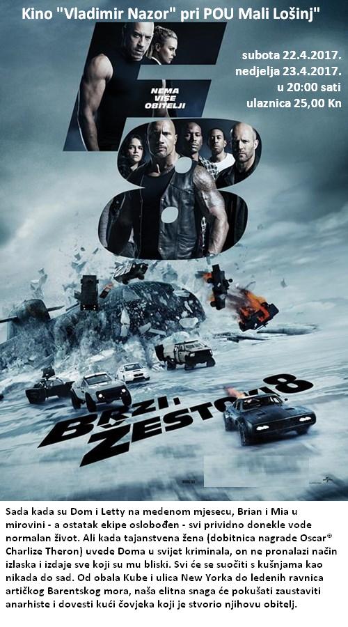 Sada kada su Dom i Letty na medenom mjesecu, Brian i Mia u mirovini - a ostatak ekipe oslobođen - svi prividno donekle vode normalan život. Ali kada tajanstvena žena (dobitnica nagrade Oscar® Charlize Theron) uvede Doma u svijet kriminala, on ne pronalazi način izlaska i izdaje sve koji su mu bliski. Svi će se suočiti s kušnjama kao nikada do sad. Od obala Kube i ulica New Yorka do ledenih ravnica artičkog Barentskog mora, naša elitna snaga će pokušati zaustaviti anarhiste i dovesti kući čovjeka koji je stvorio njihovu obitelj.