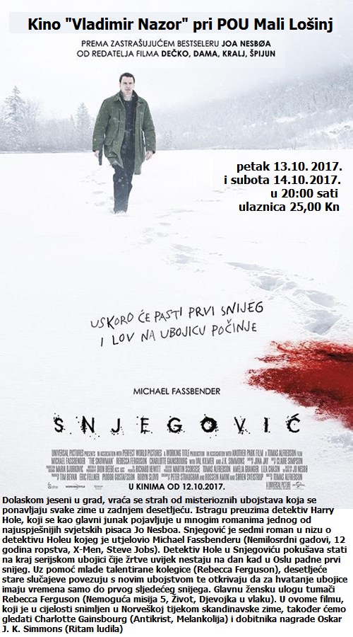 Dolaskom jeseni u grad, vraća se strah od misterioznih ubojstava koja se ponavljaju svake zime u zadnjem desetljeću. Istragu preuzima detektiv Harry Hole, koji se kao glavni junak pojavljuje u mnogim romanima jednog od najuspješnijih svjetskih pisaca Jo Nesboa. Snjegović je sedmi roman u nizu o detektivu Holeu kojeg je utjelovio Michael Fassbenderu (Nemilosrdni gadovi, 12 godina ropstva, X-Men, Steve Jobs). Detektiv Hole u Snjegoviću pokušava stati na kraj serijskom ubojici čije žrtve uvijek nestaju na dan kad u Oslu padne prvi snijeg. Uz pomoć mlade talentirane kolegice (Rebecca Ferguson), desetljeće stare slučajeve povezuju s novim ubojstvom te otkrivaju da za hvatanje ubojice imaju vremena samo do prvog sljedećeg snijega. Glavnu žensku ulogu tumači Rebecca Ferguson (Nemoguća misija 5, Život, Djevojka u vlaku). U ovome filmu, koji je u cijelosti snimljen u Norveškoj tijekom skandinavske zime, također ćemo gledati Charlotte Gainsbourg (Antikrist, Melankolija) i dobitnika nagrade Oskar J. K. Simmons (Ritam ludila).