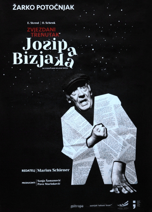 Glavni junak, Josip Bizjak, neostvareni je umjetnik i fanatik kazališta u kojem radi kao rekviziter. Kada publika unatoč otkazanoj predstavi ne napušta dvoranu, u jednom trenutku on ostaje sam na sceni i započinje istovremeno duhovitu i melankoličnu kazališnu igru kojom otkriva pogled iza kulisa kazališta. Mašta i čežnja, ambicije i stvarnost te jedan sasvim drugačiji pogled na umjetnost kroz profanu, a opet suptilnu egzistenciju jednog kazališnog gubitnika odlike su predstave koja nikoga neće ostaviti ravnodušnim.