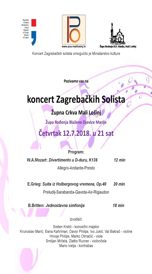 Koncert Zagrebačkih solista u Župnoj crkvi u Malom Lošinju 12.7. u 21 sat