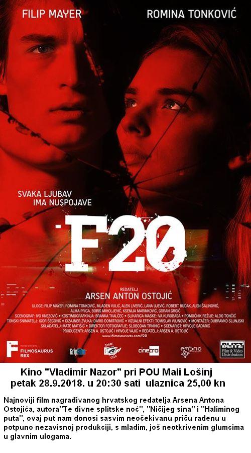 F20 je napeti psihološki triler o mladoj djevojci Martini (debitantica Romina Tonković) koja ljeti ostaje u Zagrebu i raznosi pizze, radeći u pizzeriji svog strogog oca (igra ga Mladen Vulić). Martina upoznaje stidljivog mladića Filipa (Filip Mayer iz "Zagonetnog dječaka") koji neprestano igra video igre i naručuje pizze. Nakon što Martina nagovori Filipa da ukradu novac njenom ocu i pobjegnu na Zrće, njihova nevina ljetna avantura se ubrzo pretvara u krvavu, noćnu moru. F20 je film s neočekivanim obratima, za koji su neke scene snimane na Zrću, film pun ljubavi, akcije, pjevanja i plesa, film u kojem se predstavlja najnoviji glazbeni hit mladog, perspektivnog benda "Mr. Albino", u kojem su prizori iz netom objavljene hrvatske video igre "SCUM" koja je postigla izniman svjetski uspjeh, te domaći film koji će svakako iznenaditi publiku svojom svježinom, atraktivnošću i emocijama.